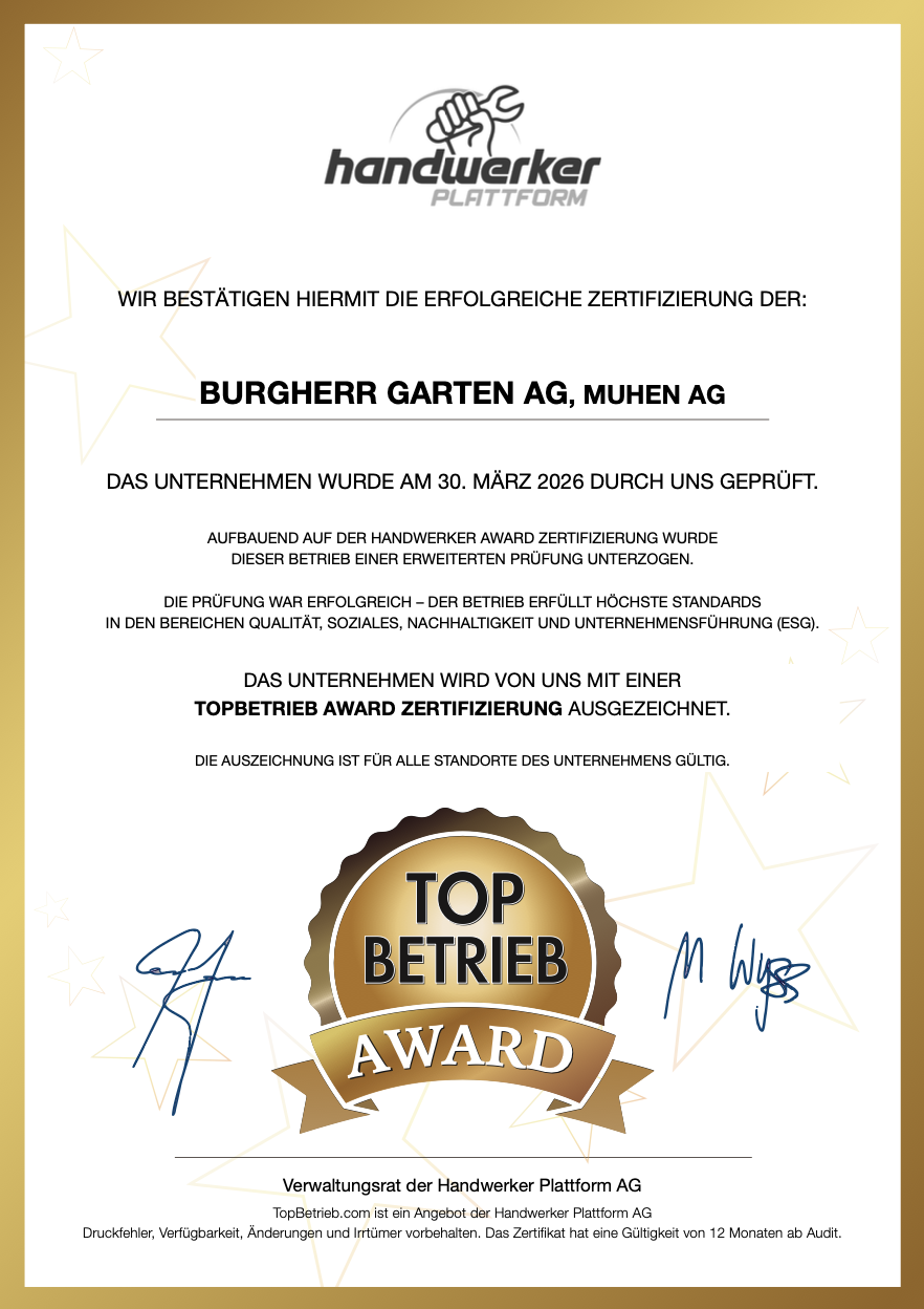 Die Burgherr Garten AG ist als Lehrbetrieb anerkannt und wurde von handwerker.ch persönlich besucht und geprüft. Das Unternehmen trägt die prestigeträchtige TopBetrieb AWARD Zertifizierung sowie die handwerker AWARD Zertifizierung. 🎖️ Das Leistungsspektrum umfasst Garten- und Landschaftsbau, Garten- und Grünflächenpflege, Gartenplanung und Gartendesign sowie Poolbau.