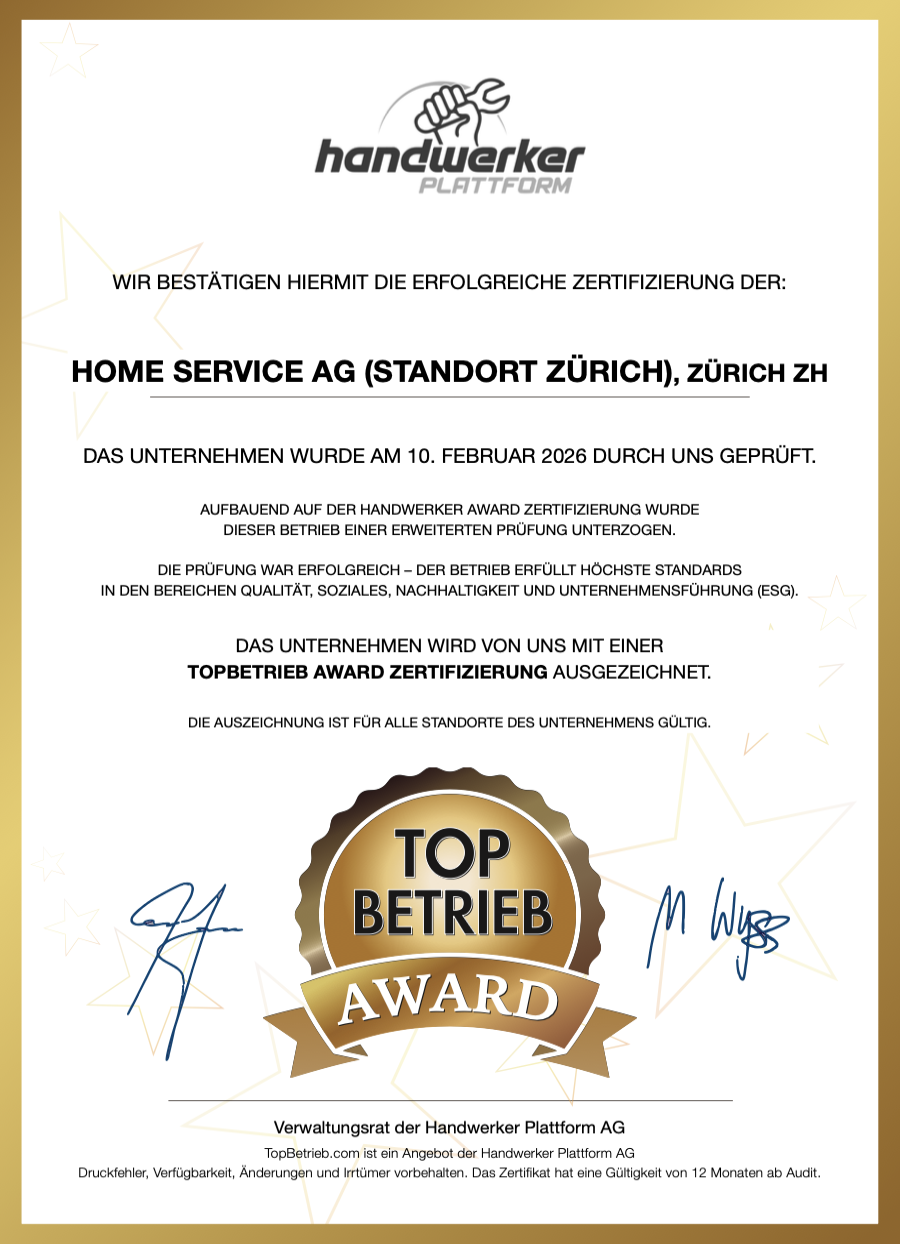 Dieser Betrieb wurde von handwerker.ch mit dem TopBetrieb AWARD zertifiziert und ausgezeichnet.
