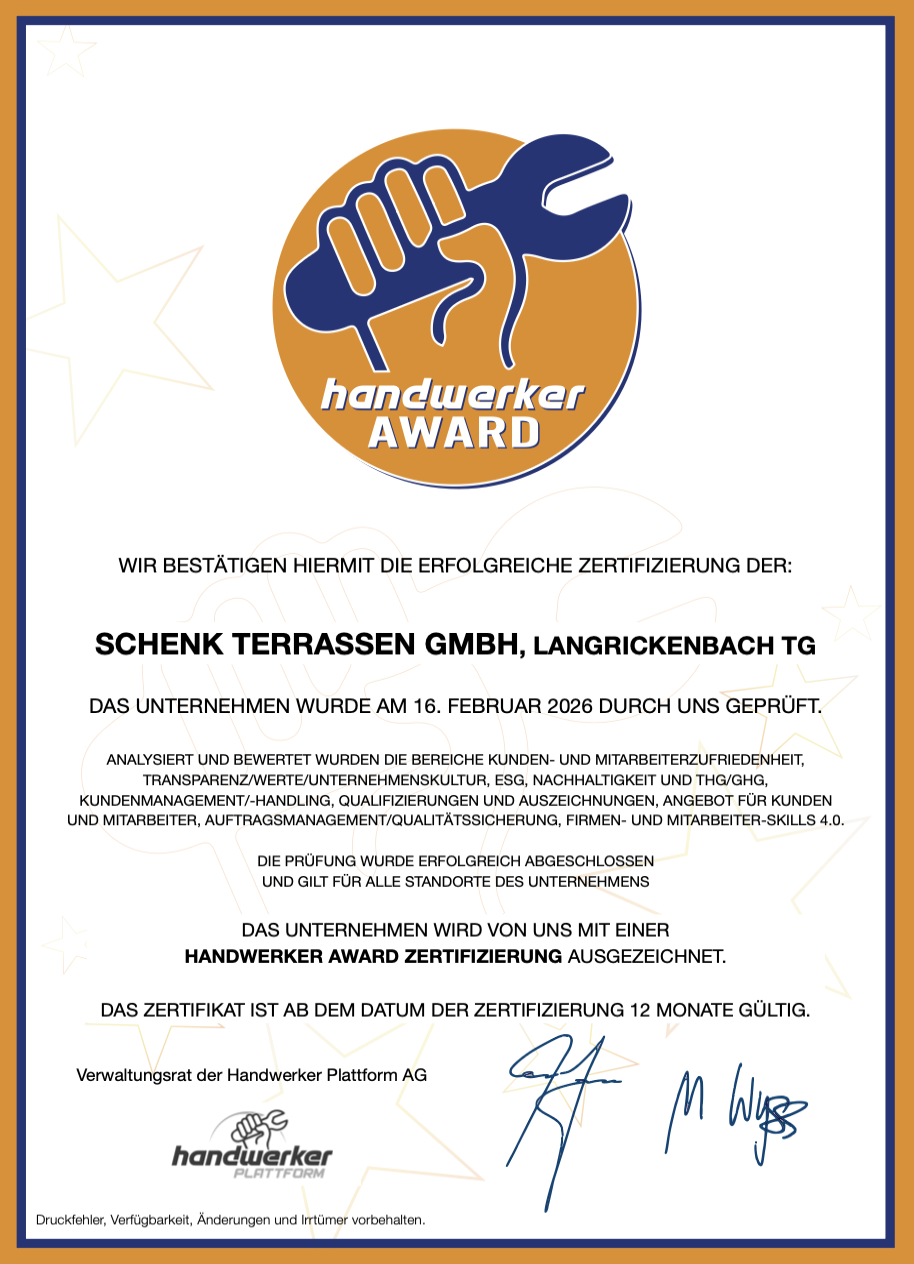 Die Schenk Terrassen GmbH gehört zu den TOP 500 Firmen im Schweizer Bau- und Handwerkssektor gemäss der "TOP500 KMU-/SBI-Rating by handwerker.ch" Liste 🏆. Zudem zählt das Unternehmen zu den führenden Firmen in der Stadt Langrickenbach sowie im Kanton Thurgau in der jeweiligen Kategorie.