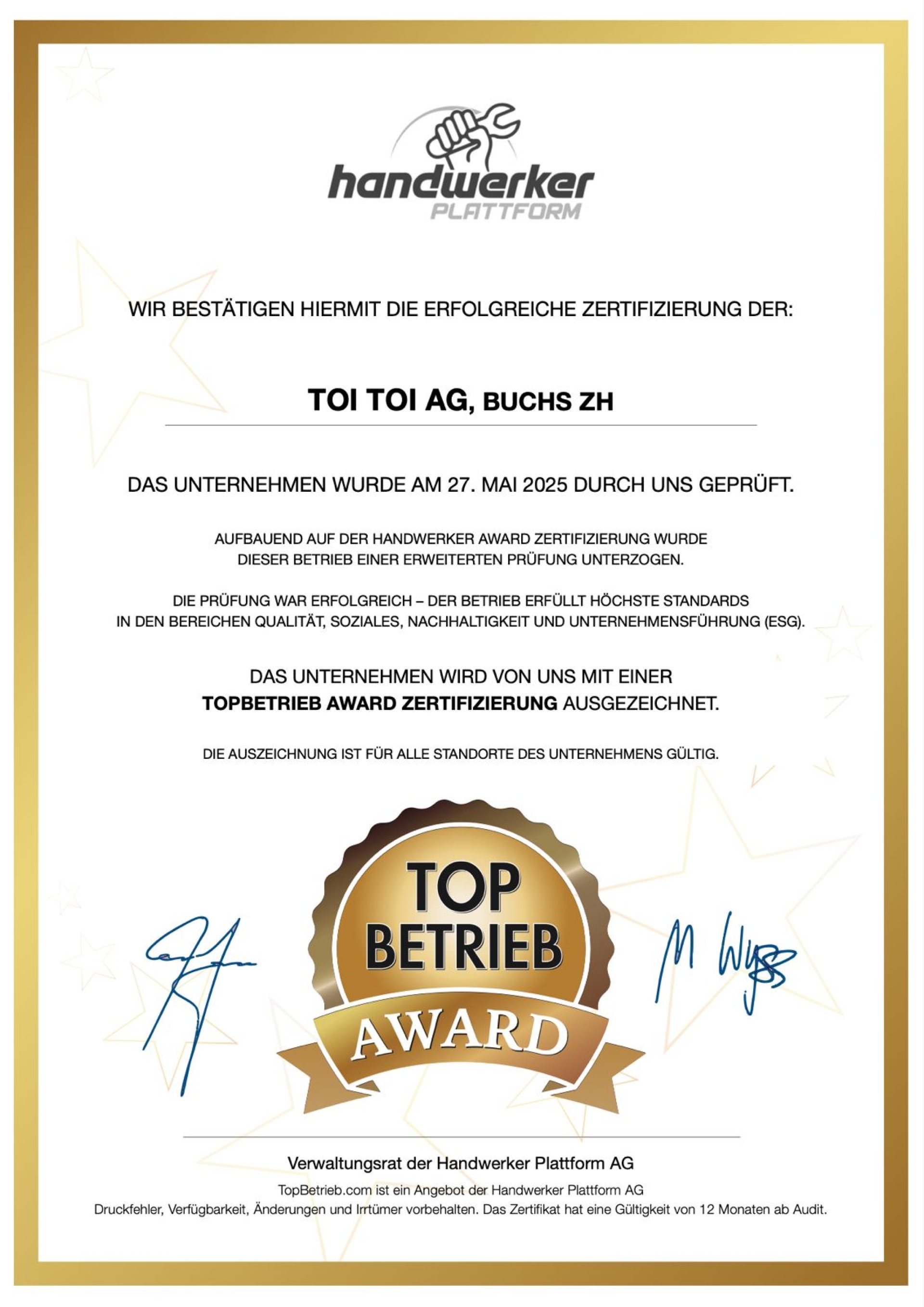 Dieser Betrieb wurde von handwerker.ch mit dem TopBetrieb AWARD zertifiziert und ausgezeichnet.