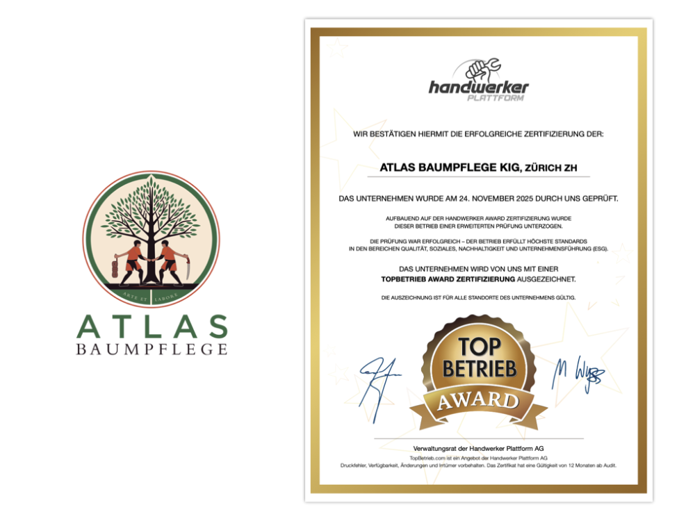 Die Atlas Baumpflege KlG wurde am 24. November 2025 erfolgreich mit dem TopBetrieb AWARD zertifiziert – ein starkes Zeichen für Innovationskraft, Qualität und nachhaltige Unternehmensführung im Schweizer KMU-Sektor.