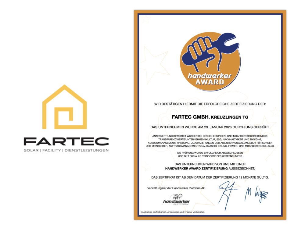 Die FARTEC GmbH hat mit dieser erfolgreichen Zertifizierung ihre Position als verlässlicher, kundenorientierter und zukunftsorientierter Qualitätsbetrieb im Bereich Photovoltaik und Energielösungen in der Schweiz unter Beweis gestellt.