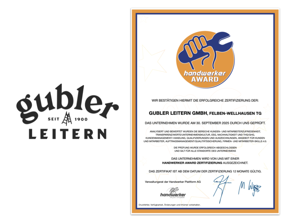 Alle geprüften Bereiche wurden erfolgreich bestätigt. Die Gubler Leitern GmbH ist somit berechtigt, auch weiterhin das Zertifikat handwerker AWARD 2025 zu führen.