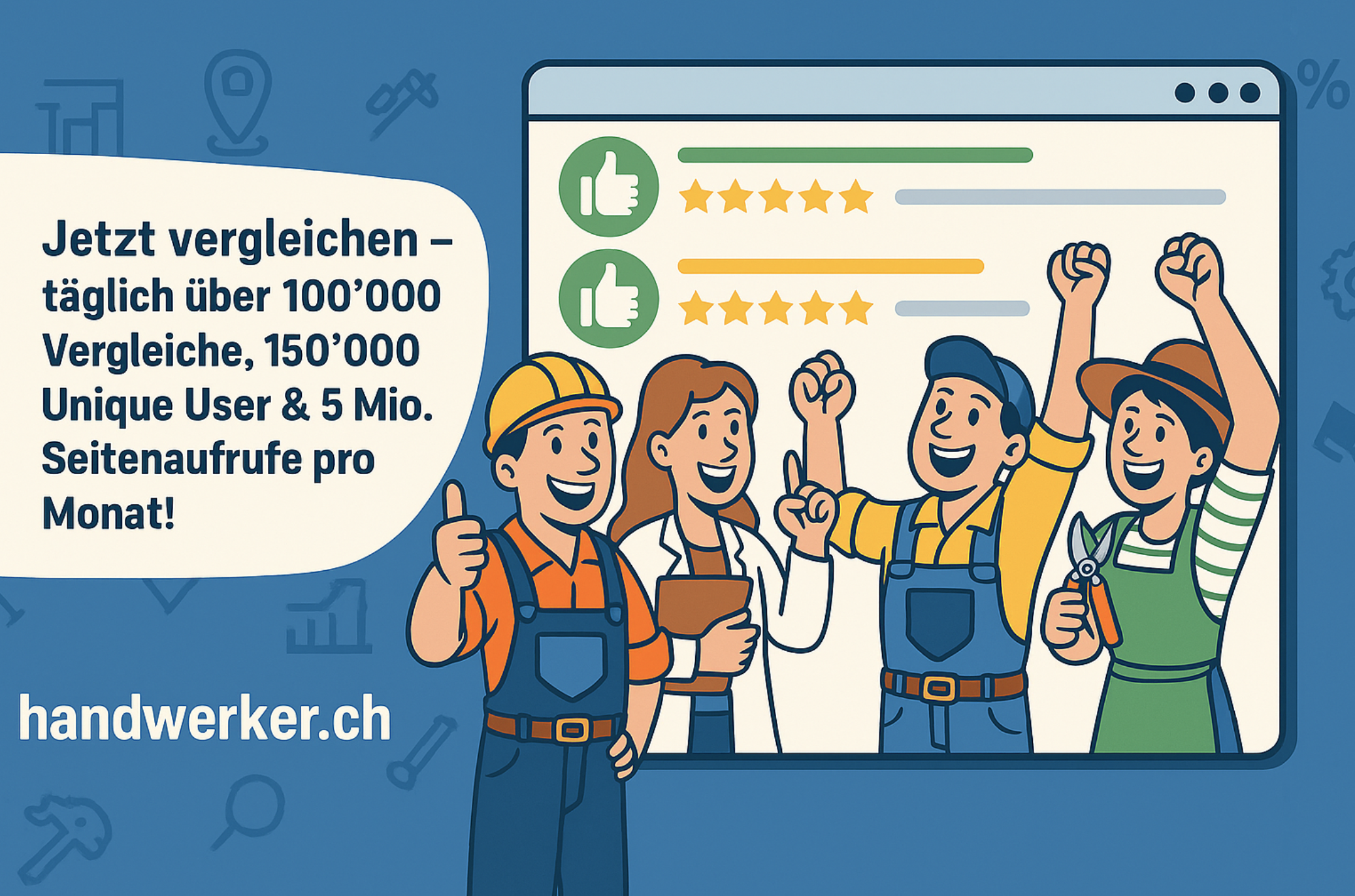đ Mit über 100'000 Firmenvergleichen pro Tag, mehr als 150'000 Unique Usern pro Monat und 4–5 Mio. Seitenaufrufen ist handwerker.ch die führende Plattform für datenbasierte Transparenz und smarte Entscheidungen.