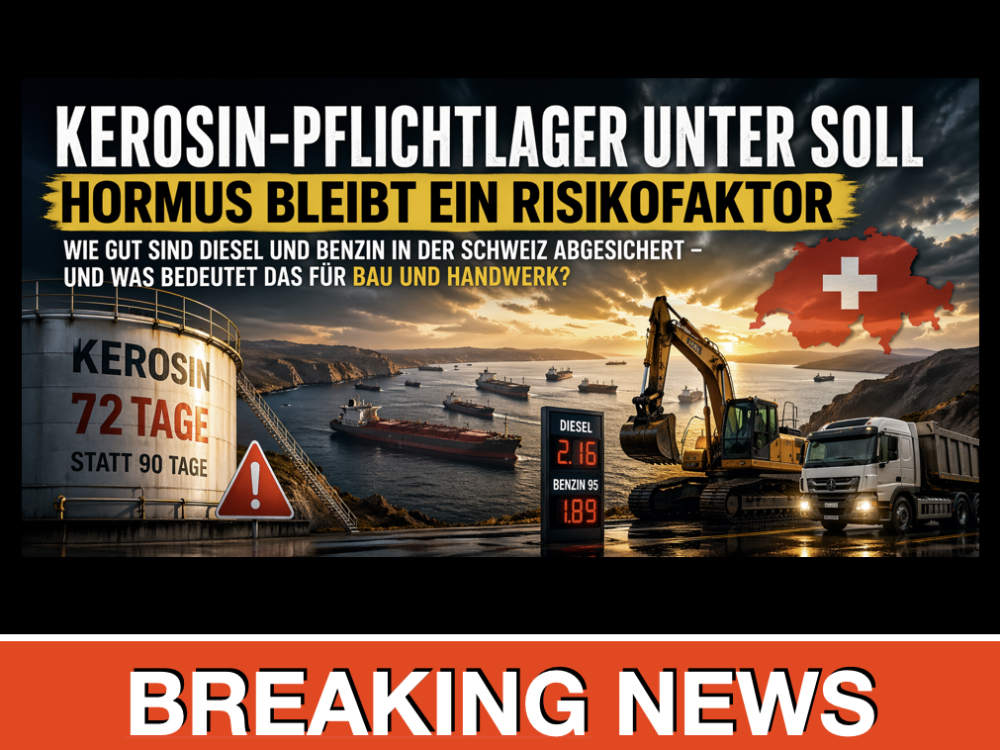 Für die Schweizer Bau- und Handwerksbranche ist nicht Flugpetrol der zentrale Punkt, sondern Diesel. Baumaschinen, Lieferwagen, Lastwagen, Werkverkehr, Servicefahrzeuge und ein Teil der Baustellenlogistik hängen weiterhin direkt oder indirekt an einer stabilen Dieselversorgung. Solange der Bund hier keine Unterdeckung meldet, ist das für Bau und Handwerk eine wichtige Entlastung.