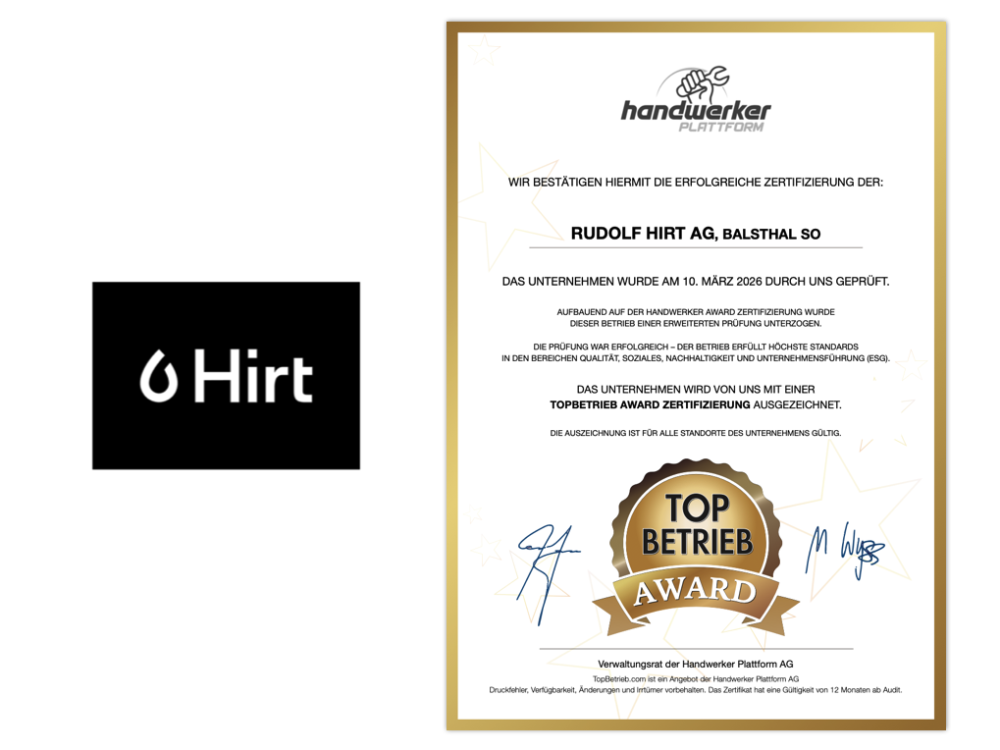 Die Rudolf Hirt AG wurde am 10. März 2026 erfolgreich mit dem TopBetrieb AWARD zertifiziert – ein starkes Signal für Qualität, Mitarbeiterorientierung und nachhaltige Weiterentwicklung.