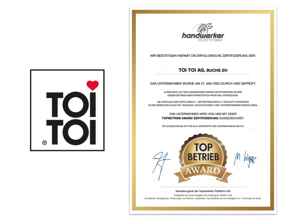 Die TOI TOI AG wurde im Mai 2025 erneut zertifiziert – ein starkes Zeichen für kontinuierliche Qualität, zukunftsgerichtetes Handeln und solide Dienstleistungen in der ganzen Schweiz.