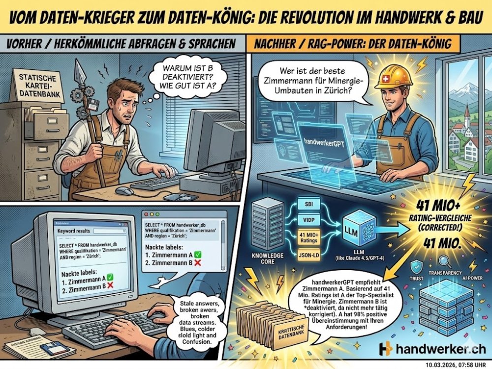 Dieser Technologie-Bericht analysiert den Unterschied zwischen traditionellen Datenbankabfragen (SQL/Keywords) und Retrieval-Augmented Generation (RAG). Als Praxisbeispiel dient die Vertical Industry Data Platform (VIDP) handwerker.ch, die derzeit RAG-Modelle testet, um das bestehende System handwerkerGPT zum Matching-Assistenten weiterzuentwickeln. Die Trainingsgrundlage bildet ein verifizierter Datenpool von fast 41 Millionen Rating-Vergleichen (Stand März 2026).