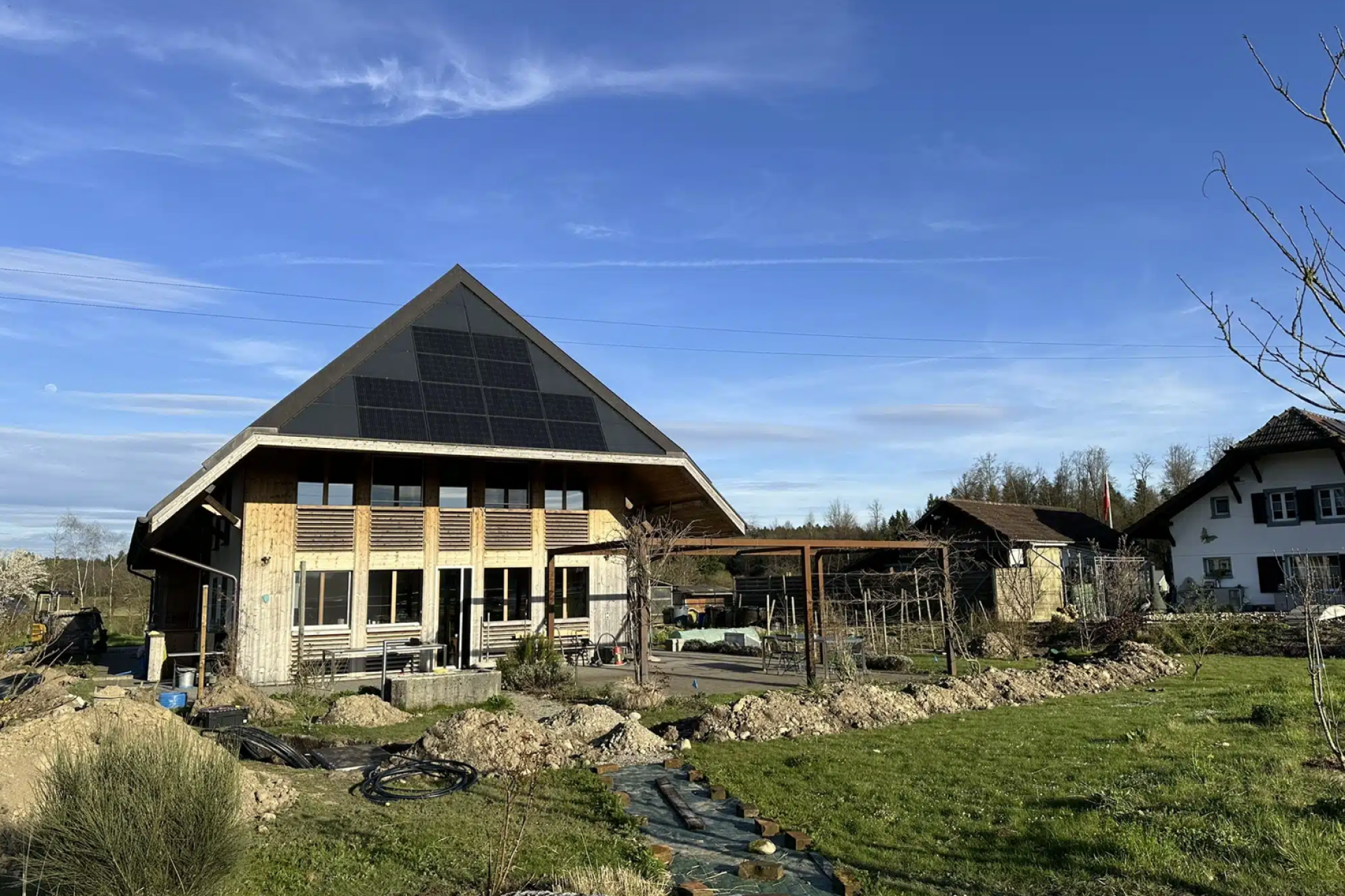Umgesetzt wurden unter anderem Tropfschläuche für Rabatten und Tomatenhaus, flexible Naan-Düsen für Gemüsebeete, hochaufsteigende Regner für den Teich sowie ein 7’500-Liter-Regenwassertank mit Tauchpumpe. Zusätzlich wurde eine automatische Grundwassernachspeisung integriert. Die Steuerung erfolgt über eine Hydrawise-App.